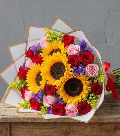 Este hermoso ramo combina la elegancia de las rosas con la alegría de los girasoles, creando una expresión perfecta de amistad y celebración. Incluye: